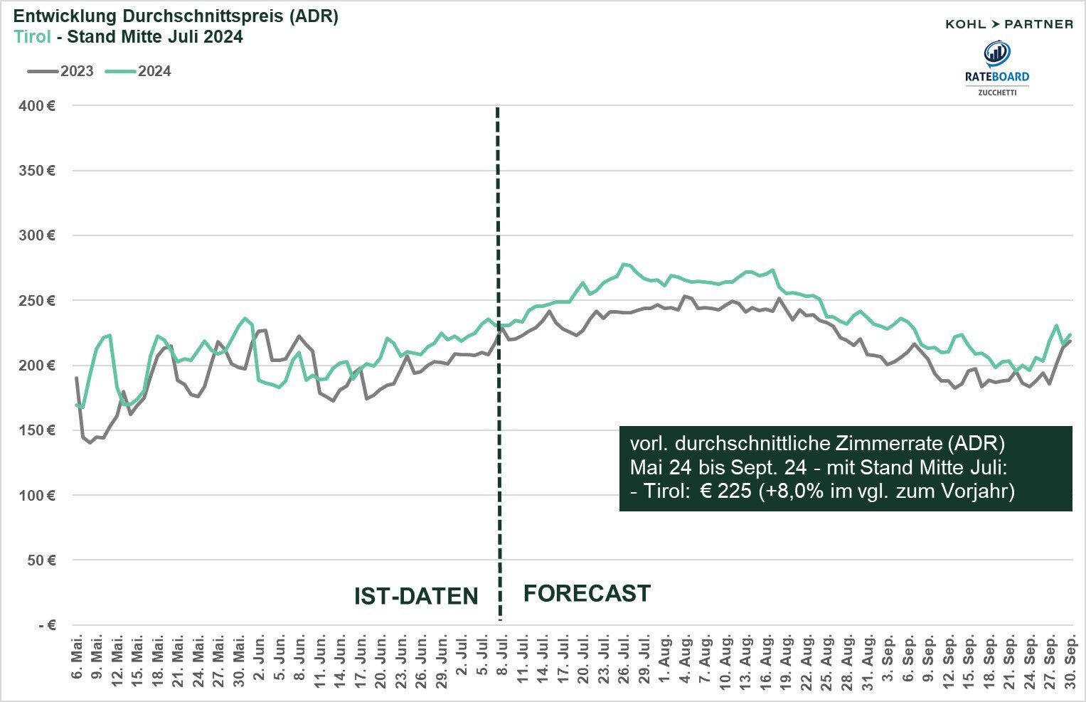Die durchschnittlichen Zimmerraten in Tirol zeigen mit einem Plus von 8% die stärkste Steigerung im Vergleich zum Vorjahr im Vergleich zu den Destinationen Südtirol und Bayern. Im Mai wurde der stärkste Zuwachs bei den Zimmerraten erzielt, mit einer Steigerung von 12% im Vergleich zum Vorjahr. Im Juni konnte die Preisdurchsetzung um 2,5% erhöht werden. Für Juli und August prognostiziert der Forecast einen Anstieg der Zimmerraten um 8,3%, während die Nachfrage voraussichtlich rückläufig ist. Im September ist ein weiterer Anstieg um knapp 9% festzustellen.